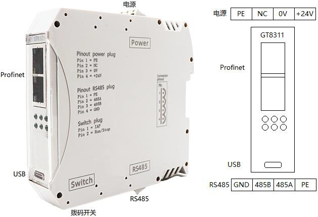 GCAN-GT-8311-MRTUS模塊集成1路24V DC電源接口、2個標準Profinet接口、1個標準以太網接口、1路標準RS485接口,GCAN-GT-8311-MRTUS模塊接線端子如圖所示。