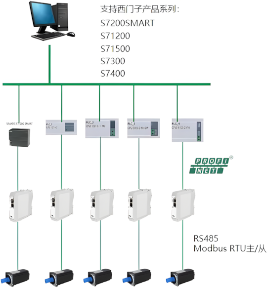 GCAN-GT-8311-MRTUM,西門子PLC可以通過8311網關,與Modbus RTU從站進行通訊;西門子PLC的Profinet接口連接8311的Profinet接口,8311的RS485接口連接Modbus RTU從站的RS485接口。