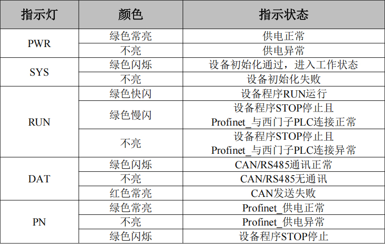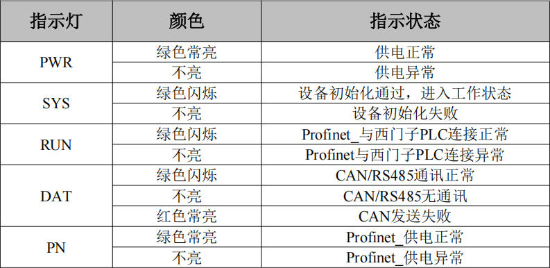 GCAN-GT-8321S的正面突出區(qū)域包含5個(gè)方形狀態(tài)指示燈。指示燈的具體指示功能及不同狀態(tài)下時(shí),GCAN-GT-8321S模塊狀態(tài)如表2.2、2.3所示。