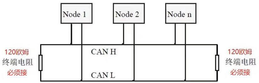 CAN-bus網(wǎng)絡(luò)采用直線拓?fù)浣Y(jié)構(gòu),總線最遠(yuǎn)的2個(gè)終端需要安裝120Ω的終端電阻;如果節(jié)點(diǎn)數(shù)目大于2,中間節(jié)點(diǎn)不需要安裝120Ω的終端電阻。對于分支連接,其長度不應(yīng)超過3米。CAN-bus總線的連接如圖4.3所示。