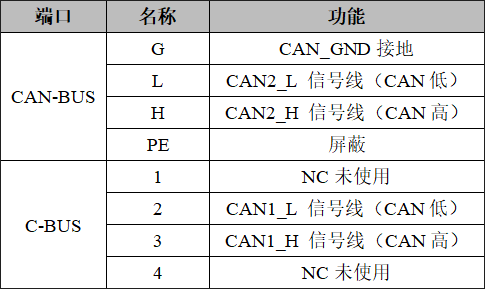 GCAN-GT-412模塊CAN-bus接口由2個(gè)4 Pin接線端子引出,可以用于連接2個(gè)CAN-bus網(wǎng)絡(luò)或者CAN-bus接口的設(shè)備,其接口定義如表所示。