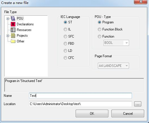 為項(xiàng)目添加文件(例如:添加ST語(yǔ)言編寫(xiě)的程序頁(yè)ST,Program),如圖所示。請(qǐng)注意,Name(名稱)一欄中填入的字符串不能以數(shù)字為開(kāi)頭。