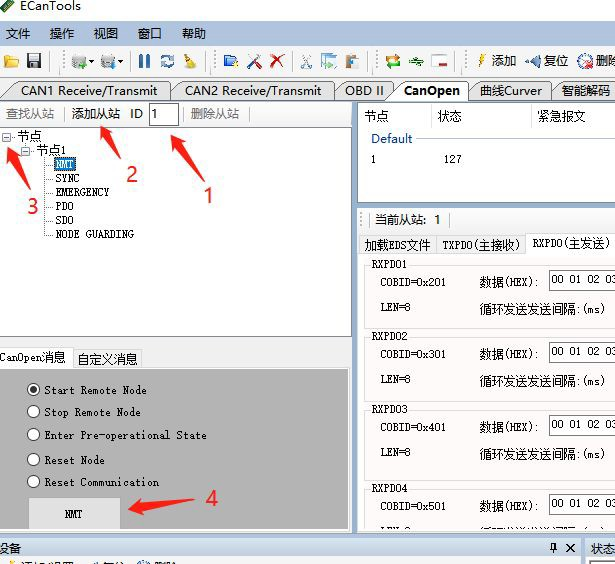 GCAN-4055模塊接收由主站發(fā)出的操作指令,幀ID為0x000,DLC為2,幀數(shù)據(jù)第一個字節(jié)為命令符,第二個字節(jié)為節(jié)點號(若為00則控制全部節(jié)點)。例如:GCAN-4055的Node ID為1,命令GCAN-4055為進入操作狀態(tài)(01),則NMT命令幀ID為0x000,幀數(shù)據(jù)為0x01,0x01。該命令也可由ECANTools軟件的CANopen插件發(fā)出。