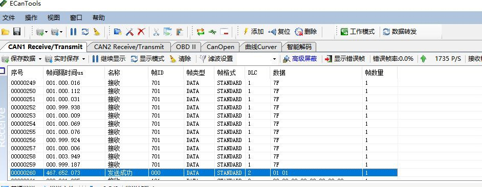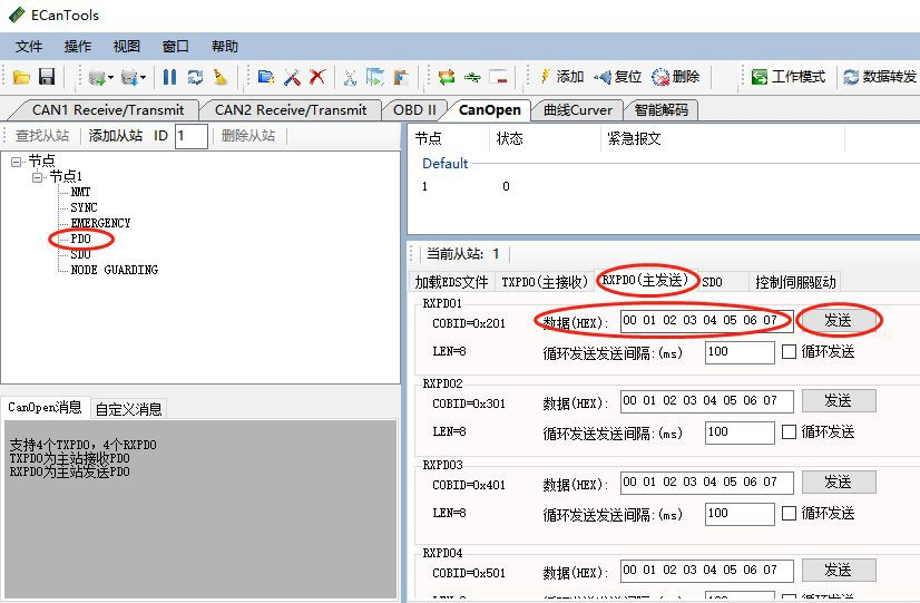 本章將使用廣成科技USBCAN-II Pro模塊及ECANTools軟件可以進行CAN總線數(shù)據(jù)的接收與發(fā)送。軟件附帶的CANopen主站功能可以幫助調(diào)試CANopen從站,非常的方便實用。