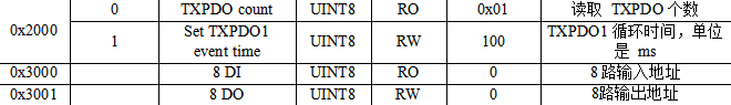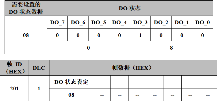 例如,GCAN-4055模塊節(jié)點號設(shè)為1。若需要設(shè)置DO_3狀態(tài)為1,其余DO狀態(tài)均為0,則RPDO1命令的幀ID為0x201,數(shù)據(jù)長度(DLC)為1,幀數(shù)據(jù)為0x08。
