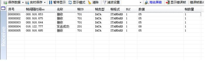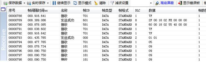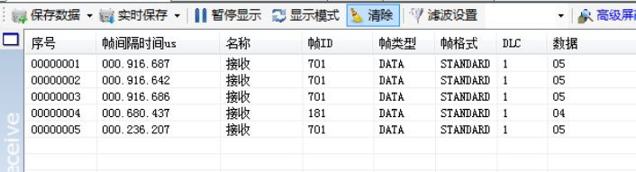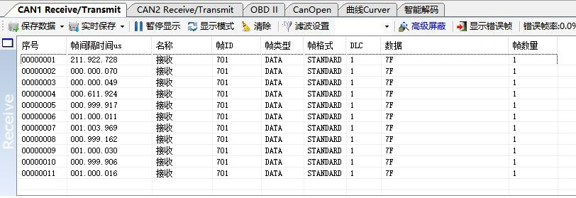 例如:通過撥碼開關(guān)設(shè)置GCAN-4055的Node ID為1(以下節(jié)點號均為1),則USBCAN-II Pro作為主站設(shè)備可接收到一條節(jié)點狀態(tài)數(shù)據(jù),幀ID為0x701,幀數(shù)據(jù)為0x7F,默認循環(huán)時間為1s(對象字典0x100C,節(jié)點守護時間)。如圖所示,使用ECANTools軟件可以收到這條數(shù)據(jù)。