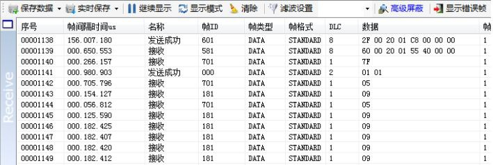 如圖所示,在ECANTools軟件的CANopen插件中,點擊左側(cè)的“PDO”,之后選取右側(cè)的“RXPDO(主發(fā)送)”,在RXPDO1中修改數(shù)據(jù)為08,點擊發(fā)送即可控制DO_3的狀態(tài)為1。如圖,回到收發(fā)界面(Receive/Transmit)可以看到USBCAN-II Pro發(fā)出的RPDO1命令(幀ID為0x201)。
