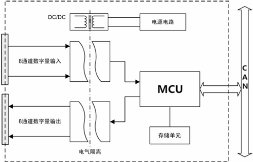 GCAN-4055模塊包含8路數(shù)字量隔離輸入、8路數(shù)字量隔離輸出、電源電路、MCU最小系統(tǒng)、CAN通信電路等幾部分,模塊原理框圖如圖所示。