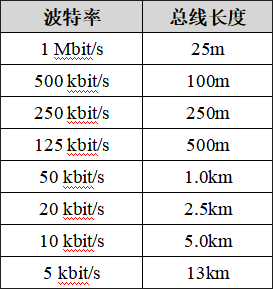 請注意:CAN-bus電纜可以使用普通雙絞線、屏蔽雙絞線。理論最大通信距離主要取決于總線波特率,最大總線長度和波特率關(guān)系詳見下表。若通訊距離超過1km,應保證線的截面積大于Φ1.0mm2,具體規(guī)格應根據(jù)距離而定,常規(guī)是隨距離的加長而適當加大。