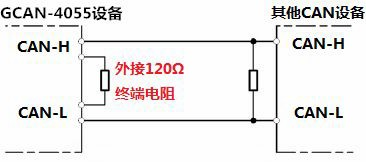 請注意:GCAN-4055模塊內(nèi)部未集成120Ω終端電阻。如果節(jié)點數(shù)目大于2,中間節(jié)點不需要安裝120Ω的終端電阻。需要使用時,將電阻兩端分別接入CAN_H、CAN_L即可,如圖所示。