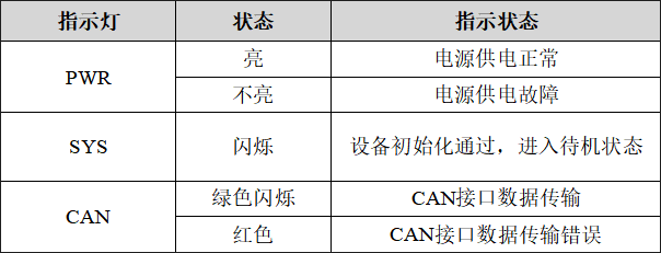 GCAN-4055模塊具有1個PWR指示燈、1個SYS指示燈、1個CAN指示燈來指示設(shè)備的運行狀態(tài)。這3個指示燈的具體指示功能及狀態(tài)如表所示。