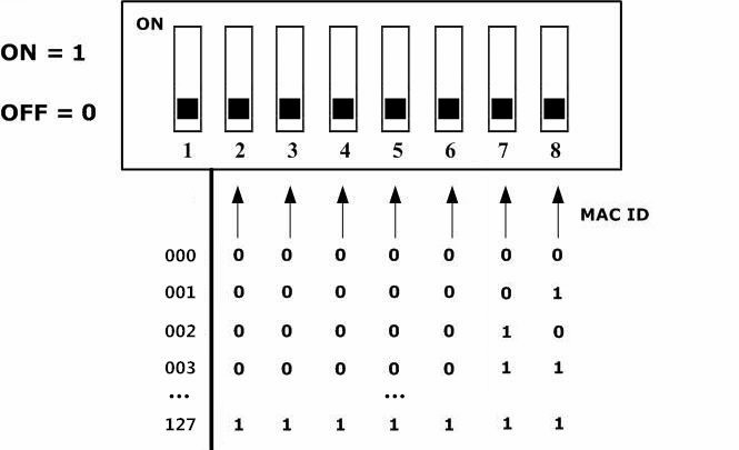 如圖所示,撥碼開關(guān)的每個位撥向“ON“位置時,該位為“1”,如果撥向“OFF”位置,則該位為“0”。撥碼開關(guān)的2-8位用于設(shè)定模塊的節(jié)點號(MAC ID),第八位為最低位,第二位為最高位,模塊的節(jié)點號(MAC ID)是各位對應的十進制值之和,通過撥碼開關(guān)設(shè)定模塊的節(jié)點號(MAC ID)的有效范圍為0~127。