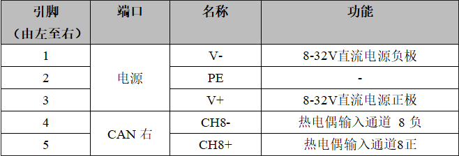 GCAN-4048模塊集成8路熱電偶輸入接口正端、8路熱電偶輸入接口負(fù)端、1路DC8~32V電源接口、1路CAN總線接口。GCAN-4048模塊4路熱電偶輸入接口正端、4路熱電偶輸入接口負(fù)端接口、CAN-bus接口如圖所示,接口定義如表所示。