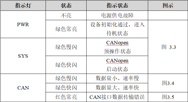 GCAN-4048模塊具有1個(gè)SYS指示燈、1個(gè)PWR指示燈、1個(gè)CAN指示燈來指示設(shè)備的運(yùn)行狀態(tài)。這3種指示燈的具體指示功能及狀態(tài)如表所示。