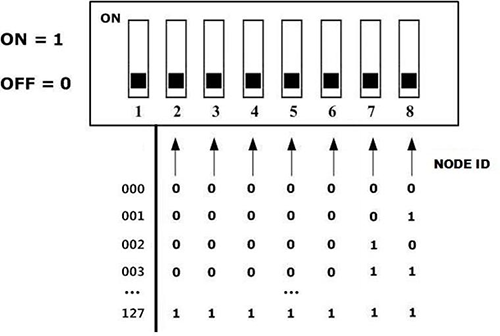如圖所示,撥碼開關(guān)的每個(gè)位撥向“ON”位置時(shí),該位為“1”,如果撥向“OFF”位置,則該位為“0”。撥碼開關(guān)的2—8位用于設(shè)定模塊的節(jié)點(diǎn)號(NODE ID),第八位為最低位,第二位為最高位,模塊的節(jié)點(diǎn)號(NODE ID)是各位對應(yīng)的十進(jìn)制值之和,通過撥碼開關(guān)設(shè)定模塊的節(jié)點(diǎn)號(NODE ID)的有效范圍為0~127。