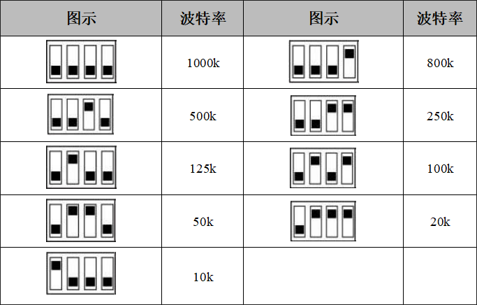 右側(cè)撥碼開關(guān)的1-4位用于設(shè)定模塊的波特率,第一位為低位,第四位為高位。波特率與開關(guān)設(shè)置對應(yīng)值如下表所示。