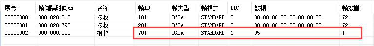 例如:默認(rèn)GCAN-4048的Node ID為1(以下節(jié)點(diǎn)號均為1),則主站設(shè)備可接收到一條節(jié)點(diǎn)狀態(tài)數(shù)據(jù),幀ID為0x701,標(biāo)準(zhǔn)幀,數(shù)據(jù)為0x05。