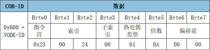 GCAN-4048模塊可通過發(fā)送SDO命令寫參數(shù),修改模塊每一路輸入的熱電偶類型、倍數(shù)、偏移量。該參數(shù)位于對象字典索引0x2401至2408、子索引0x00,數(shù)據(jù)類型Unsigned32。每一路的熱電偶類型、倍數(shù)、偏移量均可自由配置為不同類型。倍數(shù)的數(shù)據(jù)類型為Unsigned8,為了確定精度,必須大于0。偏移量的數(shù)據(jù)類型為INTEGER16,正負(fù)值均可。