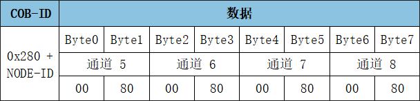 TPDO2命令的幀ID為0x281,數(shù)據(jù)長度(DLC)為8,幀數(shù)據(jù)為00 80 00 80 00 80 00 80。