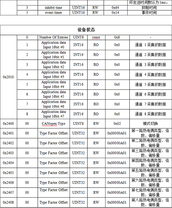 當(dāng)前狀態(tài),TPDO用于表示模擬量采集目前的狀態(tài),共有2個(gè)TPDO。其中TPDO1代表前4個(gè)通道,幀ID為0x180+Node ID。TPDO2代表后4個(gè)通道,幀ID為0x280+Node ID。