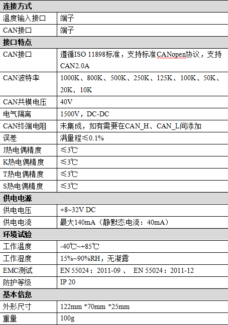一、功能概述沈陽廣成科技GCAN-4048模塊是集成1路標(biāo)準(zhǔn)CANopen接口、8路熱電偶輸入的工業(yè)級CANopen模擬量采集模塊。采用GCAN-4048模塊,用戶可同時(shí)采集8路信號,實(shí)現(xiàn)遠(yuǎn)程模擬量采集設(shè)備和CANopen網(wǎng)絡(luò)之間的連接,構(gòu)成CANopen網(wǎng)絡(luò)中模擬量信號采集的控制節(jié)點(diǎn)。GCAN-4048模塊目前支持J型、K型、T型、S型熱電偶,8路可同時(shí)自由配置熱電偶型號,倍數(shù)和偏移量均可自由配置。GCAN-4048模塊是模擬量信號采集的關(guān)鍵性工具,默認(rèn)上電后自動接收數(shù)據(jù),同時(shí)該模塊具有體積小巧、接線便捷等特點(diǎn)。GCAN-4048模塊的總線接口集成隔離保護(hù)模塊,使其避免由于瞬間的過壓過流而對模塊造成損壞。采用DIN導(dǎo)軌的固定方式,可使其更容易集成到各種控制柜中。