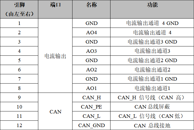 GCAN-4068模塊集成8路0-24mA電流輸出接口、8路0-24mA電流輸出接口GND端、1路DC8~32V電源接口、1路CAN總線接口。GCAN-4068模塊4路電流輸出接口、4路0-24mA電流輸出接口GND端接口、CAN-bus接口如圖所示,接口定義如表所示。