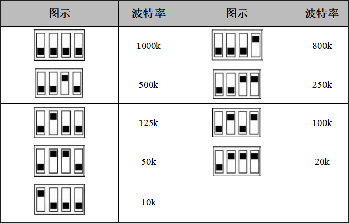 右側(cè)撥碼開(kāi)關(guān)的1-4位用于設(shè)定模塊的波特率,第一位為低位,第四位為高位。波特率與開(kāi)關(guān)設(shè)置對(duì)應(yīng)值如下表所示。