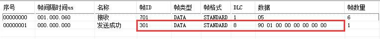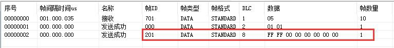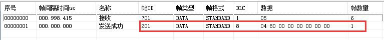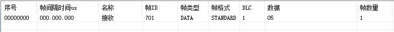 例如:默認(rèn)GCAN-4068的Node ID為1(以下節(jié)點(diǎn)號(hào)均為1),則主站設(shè)備可接收到一條節(jié)點(diǎn)狀態(tài)數(shù)據(jù),幀ID為0x701,標(biāo)準(zhǔn)幀,數(shù)據(jù)為0x05。