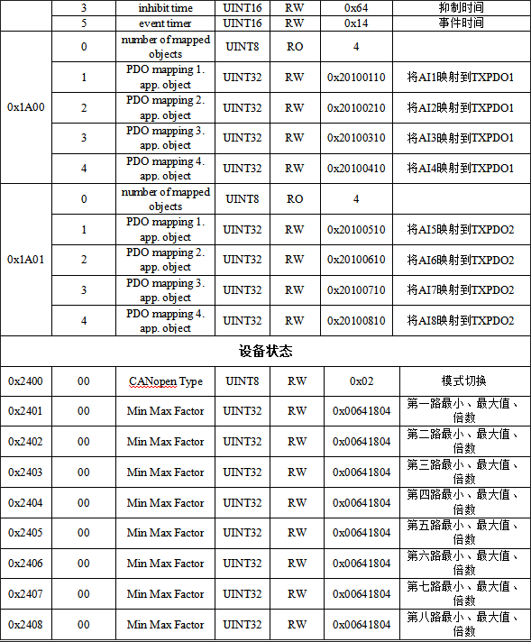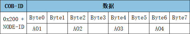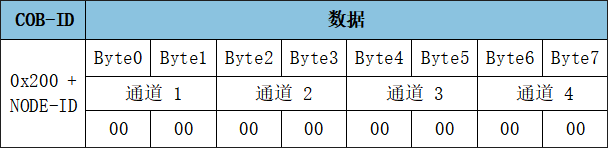 當(dāng)前狀態(tài),RPDO用于表示控制(寫(xiě)入)通道的狀態(tài),共有2個(gè)RPDO。其中RPDO1代表前4個(gè)通道,幀ID為0x180+Node ID。TPDO2代表后4個(gè)通道,幀ID為0x280+Node ID。