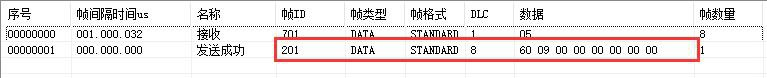 若需要通道1輸出的電流為最大值24,則對(duì)應(yīng)數(shù)據(jù)為24*倍數(shù),倍數(shù)值為100,則通道1對(duì)應(yīng)數(shù)據(jù)為24*100=2400,轉(zhuǎn)換為16進(jìn)制是09 60,又因?yàn)閿?shù)據(jù)傳輸中低位在前高位在后,所以數(shù)據(jù)為60 09。若其余通道無(wú)輸出,通道對(duì)應(yīng)數(shù)據(jù)為00 00。則RPDO1命令的幀ID為0x201,數(shù)據(jù)長(zhǎng)度(DLC)為8,幀數(shù)據(jù)為60 09 00 00 00 00 00 00。