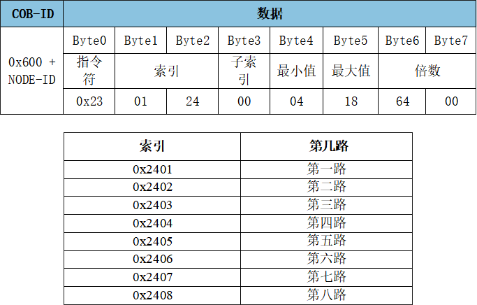 報(bào)文:ID:0x601數(shù)據(jù):23 01 24 00 00 18 AB 0A,設(shè)置第1路輸出最小值為0,即16進(jìn)制的0x00;最大值為24,即16進(jìn)制的0x18;倍數(shù)為2730,即16進(jìn)制的0x0A AB。