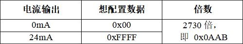 為了輸入精度,倍數(shù)可自由配置,例如:設(shè)置電流輸出0mA為0x00,設(shè)置電流輸出24mA為0xFFFF,即十進(jìn)制65535,那么倍數(shù)為(65536-0)/24=2730.6,取2730時(shí),設(shè)置數(shù)據(jù)達(dá)不到0xFFFF;由于大于24mA輸出為24mA,設(shè)置數(shù)據(jù)取0xFFFF即可,故取倍數(shù)為2731,即十六進(jìn)制的0x0A AB。(1)配置操作舉例