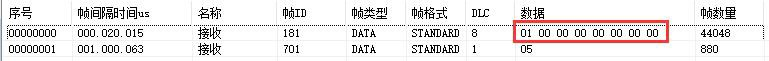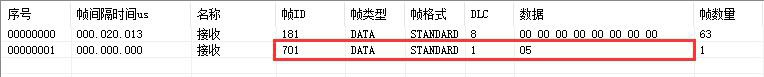 例如:默認(rèn)GCAN-4128的Node ID為1(以下節(jié)點(diǎn)號(hào)均為1),則主站設(shè)備可接收到一條節(jié)點(diǎn)狀態(tài)數(shù)據(jù),幀ID為0x701,標(biāo)準(zhǔn)幀,數(shù)據(jù)為0x05。