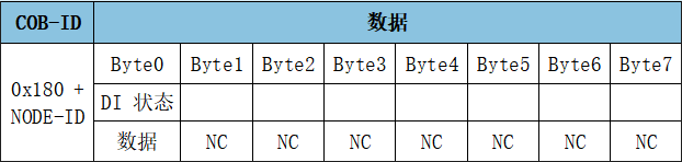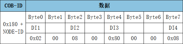 GCAN-4128模塊采用PDO(Process Data Object,過程數(shù)據(jù)對(duì)象)對(duì)數(shù)字量信號(hào)進(jìn)行采集或?qū)懭胼敵?。DI、DO每一路的具體位置均可自由配置。其中,TPDO1用于表示數(shù)字量DI狀態(tài),幀ID為0x180+Node ID,默認(rèn)幀數(shù)據(jù)第一個(gè)字節(jié)為數(shù)字量輸入狀態(tài)。PDO1: