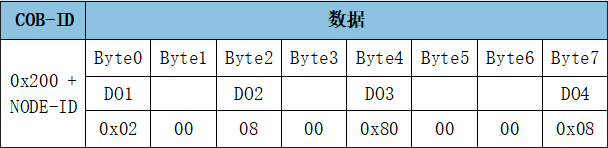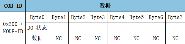 RPDO1用于表示改變(寫入)數(shù)字量輸出的狀態(tài),幀ID為0x200+Node ID,數(shù)字量輸出默認(rèn)由一個(gè)字節(jié)來控制(寫入),DO4在高位,DO1在低位。RPDO1: