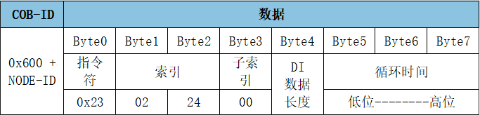 GCAN-4128模塊可通過發(fā)送SDO命令寫參數(shù),修改每一路DI的顯示位置。該傳輸類型的數(shù)據(jù)位于對(duì)象字典索引0x2404、子索引0x00,數(shù)據(jù)類型Unsigned32。最多設(shè)置在第64位顯示。換算成16進(jìn)制,數(shù)據(jù)最低0x01,最高0x40,0x00或者0x40以上不生效。