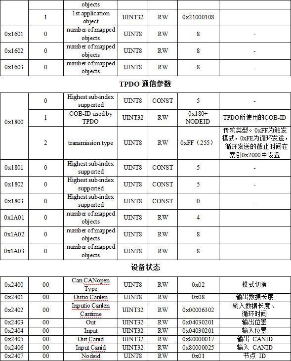 當(dāng)前狀態(tài),TPDO1用于表示數(shù)字量DI狀態(tài),如圖所示,幀ID為0x180+NodeID,默認(rèn)幀數(shù)據(jù)第一個(gè)字節(jié)為數(shù)字量輸入狀態(tài)。DI4在高位,DI1在低位。RPDO1用于表示控制(寫入)數(shù)字量輸出的狀態(tài),幀ID為0x200+Node ID,數(shù)字量輸出默認(rèn)由一個(gè)字節(jié)來控制(寫入),DO4在高位,DO1在低位。七、標(biāo)準(zhǔn)CANopen模式