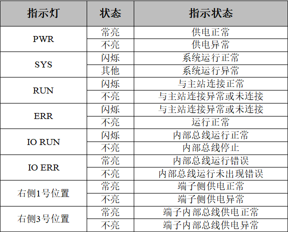 GCAN-IO-8200 EtherCAT總線耦合器具有兩組狀態(tài)指示燈。左側(cè)區(qū)域包含6個圓形狀態(tài)指示燈,右側(cè)區(qū)域包含2個小型電源指示燈。指示燈的具體指示功能見下表。指示燈處于不同狀態(tài)下時,GCAN-IO-8200模塊狀態(tài)如下表所示。