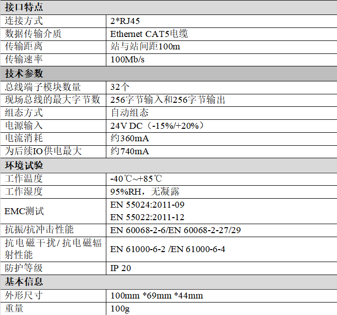 (1)2個EtherCAT總線接口,EtherCAT/IN和EtherCAT/OUT(RJ45);(2)總線傳輸速率:100Mbps;(3)總線傳輸距離(站與站間距):100m;(4)總線端子模塊數(shù)量最多為32個;(5)組態(tài)方式根據(jù)IO插片順序組態(tài);(6)電源采用24V DC(-15%/+20%);(7)電流消耗約360mA;(8)為后續(xù)IO供電最大電流約740mA;(9)電氣隔離為1500 Vrms;(10)工作溫度范圍:-40℃~+85℃;(11)尺寸:長100mm*寬69mm*高48mm。- GCAN-PLC產(chǎn)品功能及應(yīng)用視頻: