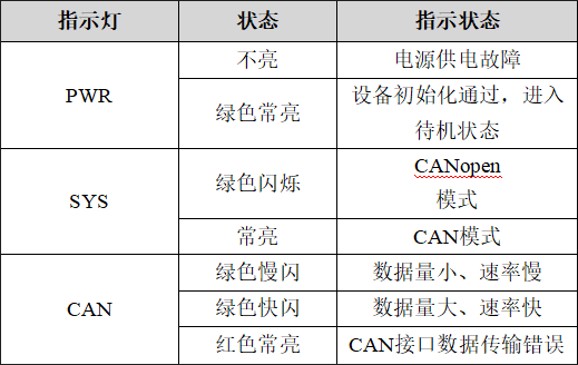 GCAN-4056模塊具有1個(gè)PWR指示燈、1個(gè)SYS指示燈、1個(gè)CAN指示燈來指示設(shè)備的運(yùn)行狀態(tài)。這3種指示燈的具體指示功能及狀態(tài)如表所示。