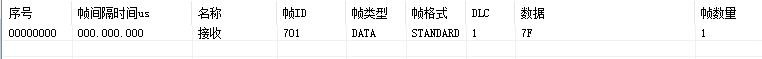 例如:默認(rèn)GCAN-4056的Node ID為1(以下節(jié)點(diǎn)號(hào)均為1),則主站設(shè)備可接收到一條節(jié)點(diǎn)狀態(tài)數(shù)據(jù),幀ID為0x701,幀數(shù)據(jù)為0x7F。