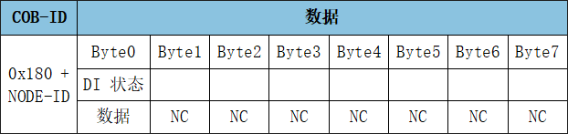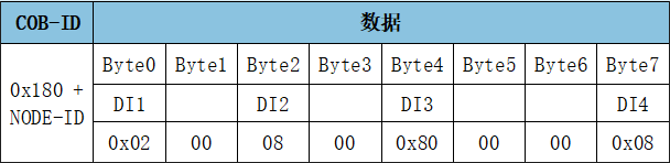 GCAN-4056模塊采用PDO(Process Data Object,過程數(shù)據(jù)對(duì)象)對(duì)數(shù)字量信號(hào)進(jìn)行采集或?qū)懭胼敵?。DI、DO每一路的具體位置均可自由配置。其中,TPDO1用于表示數(shù)字量DI狀態(tài),幀ID為0x180+Node ID,默認(rèn)幀數(shù)據(jù)第一個(gè)字節(jié)為數(shù)字量輸入狀態(tài)。TPDO1: