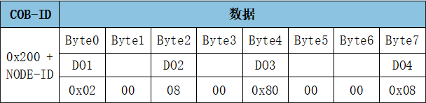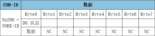 RPDO1用于表示改變(寫入)數(shù)字量輸出的狀態(tài),幀ID為0x200+Node ID,數(shù)字量輸出默認(rèn)由一個(gè)字節(jié)來控制(寫入),DO4在高位,DO1在低位。RPDO1: