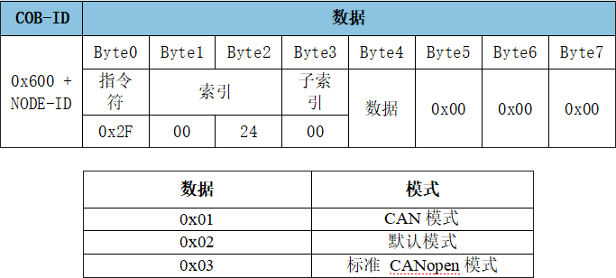 GCAN-4056模塊可通過發(fā)送SDO命令寫參數(shù),修改模塊的使用模式。該參數(shù)位于對(duì)象字典索引0x2400、子索引0x00,數(shù)據(jù)類型Unsigned8。