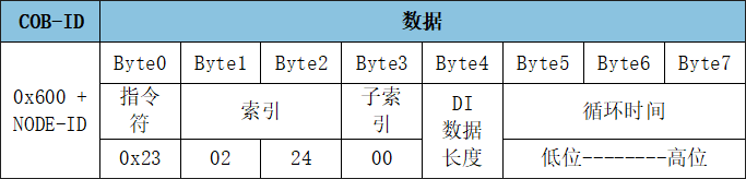 GCAN-4056模塊可通過發(fā)送SDO命令寫參數(shù),修改每一路DI的顯示位置。前4路傳輸類型的數(shù)據(jù)位于對(duì)象字典索引0x2407、子索引0x00,數(shù)據(jù)類型Unsigned32。最多設(shè)置在第64位顯示。換算成16進(jìn)制,數(shù)據(jù)最低0x01,最高0x40,0x00或者0x40以上不生效。
