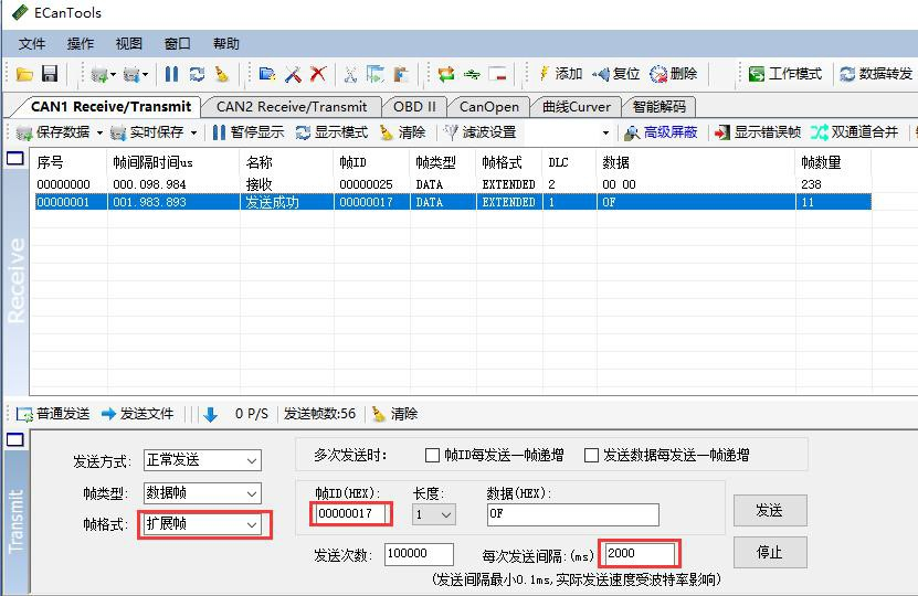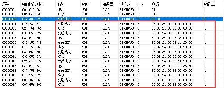 例如:GCAN-4056的Node ID為1,命令GCAN-4056為進(jìn)入操作狀態(tài)(01),則NMT命令幀ID為0x000,幀數(shù)據(jù)為0x01,0x01。主站發(fā)送數(shù)據(jù)01 01,GCAN-4056模塊進(jìn)入05啟動(dòng)狀態(tài)。