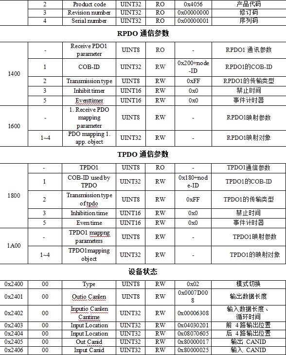 當(dāng)前狀態(tài),TPDO1用于表示數(shù)字量DI狀態(tài),如圖所示,幀ID為0x180+NodeID,默認(rèn)幀數(shù)據(jù)第一個(gè)字節(jié)為數(shù)字量輸入狀態(tài)。DI4在高位,DI1在低位。RPDO1用于表示控制(寫入)數(shù)字量輸出的狀態(tài),幀ID為0x200+Node ID,數(shù)字量輸出默認(rèn)由一個(gè)字節(jié)來控制(寫入),DO4在高位,DO1在低位。