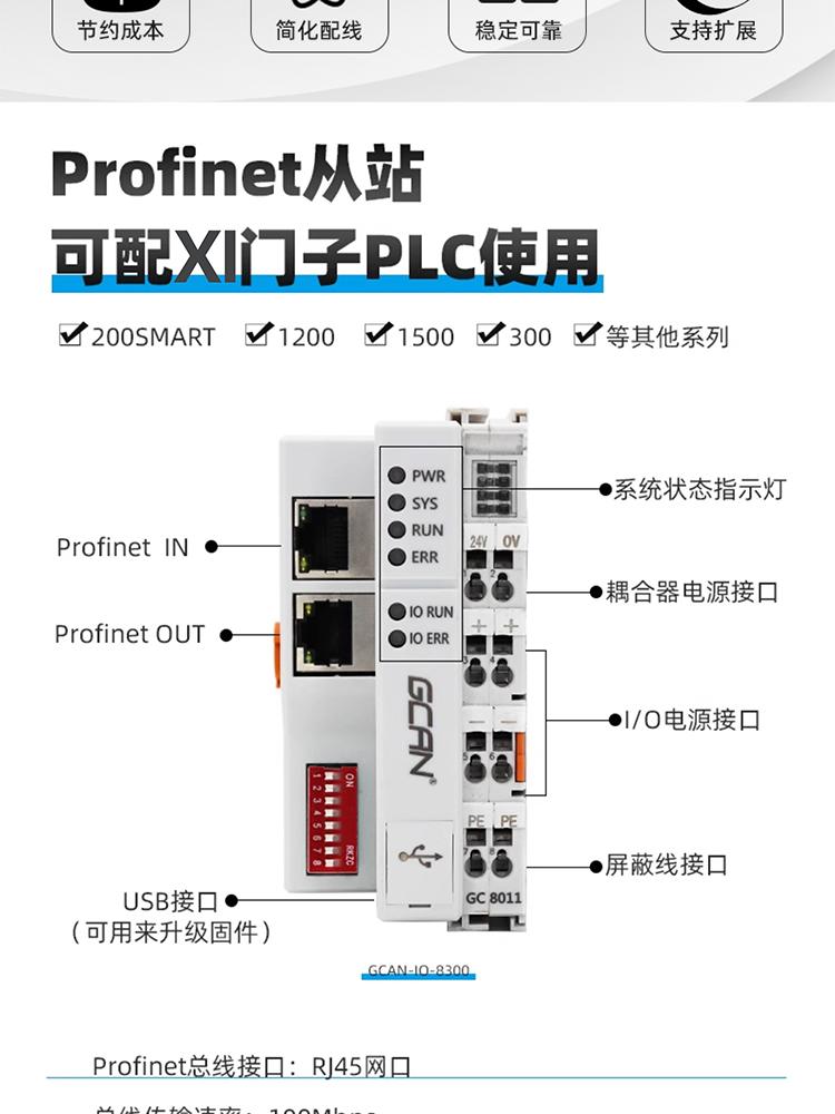 - GCAN-IO-8300 Profinet總線耦合器是我公司推出的基于Profinet總線自主研發(fā)的高性能總線通用遠(yuǎn)程IO模塊,為用戶節(jié)約成本,簡化配線,提高系統(tǒng)可靠性,這些IO端子模塊可以通過模塊化的方式進行擴展。一個完整的節(jié)點由一個總線耦合器、1-32個任意數(shù)量的端子模塊以及一個終端端子模塊組成。采用GCAN-IO-8300 Profinet總線耦合器,通過GC-bus擴展技術(shù),可極為方便地建立I/O連接,最多可連接32個輸入/輸出端子模塊。此系列IO特別適用于現(xiàn)場點數(shù)多,信號種類多集中控制。