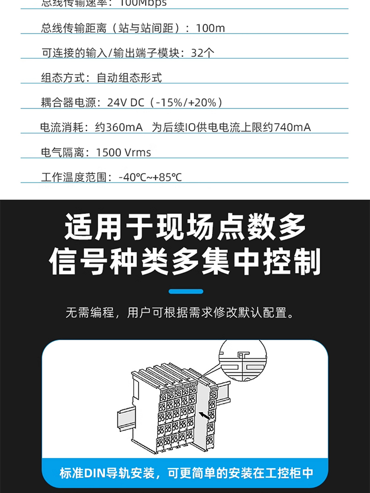 (1)2個Profinet總線接口(RJ45);(2)總線傳輸速率:100Mbps;(3)總線傳輸距離(站與站間距):100m;(4)總線端子模塊數(shù)量最多為32個;(5)組態(tài)方式為自動組態(tài)形式;(6)電源采用24V DC(-15%/+20%);(7)電流消耗約360mA;(8)為后續(xù)IO供電最大電流約740mA;(9)電氣隔離為1500 Vrms;(10)工作溫度范圍:-40℃~+85℃;(11)尺寸:長100mm*寬69mm*高48mm。- GCAN-PLC產(chǎn)品功能及應(yīng)用視頻:
