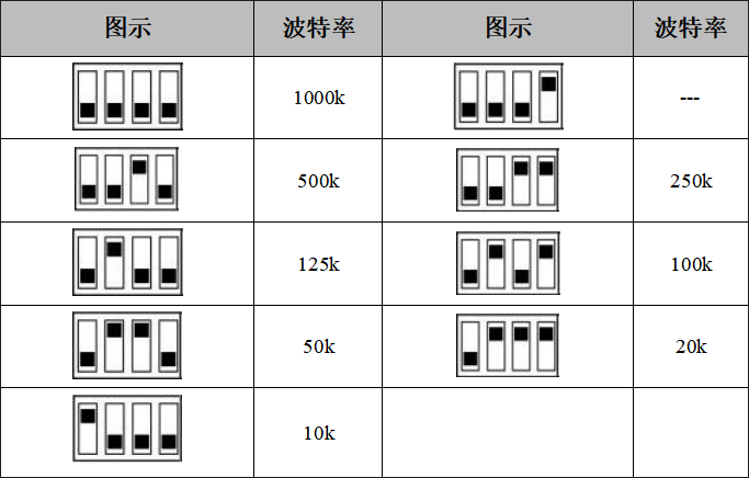 右側(cè)撥碼開(kāi)關(guān)的1-4位用于設(shè)定模塊的波特率,第一位為低位,第四位為高位。波特率與開(kāi)關(guān)設(shè)置對(duì)應(yīng)值如下表所示。